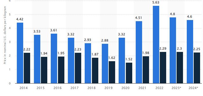Not a coffee drinker myself but thought I'd look up the price of coffee beans. I found that the price per kilogram of both major varieties of coffee is in 2023 nearly identical to the price in 2014. Thus any increases you are paying are for factors other than bean price. the website did not explain how they know the cost of beans in 2024 unless they are using future contracts.