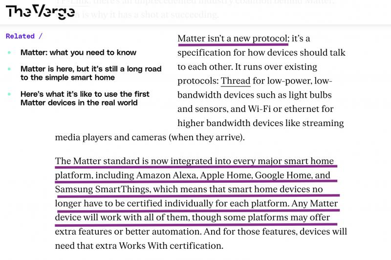 The good thing is you don't have to have a separate app but be able to use your Apple or Android apps to control functions. It's uncertain if older smart devices like Nest will work on this platform, so if you are in the market for a smart device, video camera, garage door, thermostat, etc be sure it's a Matter compatible to future-proof yourself. |