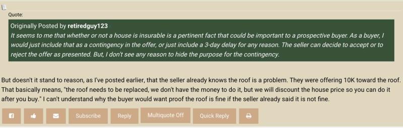Or the roofing contingency was to see if the home was insurable and the three day window in any legal contract would allow me to see if the house was as represented to me by an agent that works for the seller. You are an antagonist I will give you that. Have a wonderful day.