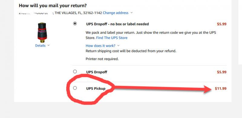 Not sure what your point was. Last time I managed a THE UPS STORE was from JAN 2012 to SEPT 2016 which was BEFORE clothing was free which was why I said they "recently" started that. Mybe your bra was a special. Or maybe I don't remember the date clothes were free stsrted. If anything other then that was stated by me it was either a typo or a misunderstand of my typing. Here, see below, I pretended I want to return something I got a few days ago because I didn't like it. Note the fees: $5.99 return shipping fee if I drop it off at a store or in a UPS box or find a driver driving around town and give it to her. $11.99 if I want to SCHEDULE UPS TO COME TO ME AND PICK IT UP which equals $5.99 return fee PLUS $5 UPS CALL TAG FEE. If I told them it was DAMAGED I would be charged NOTHING. They are charging $5 extra/more/in addition in order to have UPS SCHEDULED to come to you to pick it up (a UPS CALL TAG is issued). If you hand it to a driver that you see on your block you won't be charged the extra $5 because you did not schedule the pickup through AMZ. It's only when YOU REQUEST A DRIVER TO COME TO YOUR HOME THROUGH AMZ that you are charged a pick-up fee ON TOP OF return shipping fee and ONLY if it is NOT an AMZ error or damaged item or clothing. Maybe I didn;t write what I meant but I know exactly what I mean since I dealt with it for 4 years dealing with AMZ, Apple, Comcast and many others and their returns as we contracted with all of them and more. There are of course EXCEPTIONS to every policy. Hopefully that cleared up any misunderstanding I may have left you with. See screen print below : |