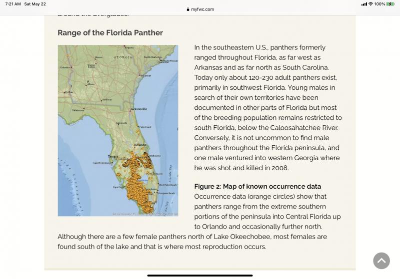 I don’t think there has been a documented sighting of a Florida panther in The Villages. They weigh about four to six times as much as a bobcat. More like Great Dane size. If you live near a swamp and have seen bobcats, be careful about leaving your little lap dog outside by itself at night, but you don’t do that, anyway. It won’t be attacked if you are walking it on a leash, and you won’t, either.