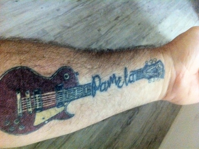 If I were to get a tattoo it would look like this. In fact it does. Had this inked on last year. Its my 1976 Les Paul Deluxe and my wife's name. Have to warn you, they are addictive. Hard to stop at one.